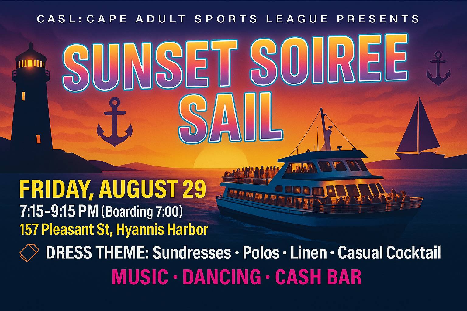 Join us for an unforgettable evening on the water at CASL’s Sunset Soirée Sail, setting off from Hyannis Harbor on Friday, August 29th. Boarding begins at 7:00 PM, and we’ll depart promptly at 7:15 PM to chase the Cape Cod sunset in style.